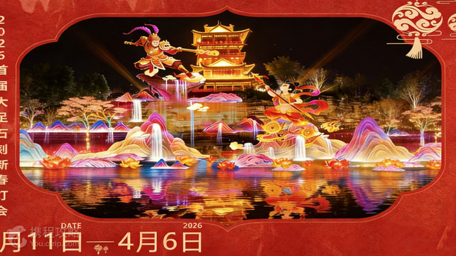 2026首届大足石刻新春灯会包含:互动灯展、灯组70+,花开见福、千手观音、一叶菩提、玉手托珠、莲花童子、时光隧道、海棠奇景、天上宫阙、互动萌宠、仿真恐龙、福寿迷宫、宝相安卧、慈光千华、父母恩重、大足五金、天下大足、鹊桥、互动响鼓、打沙包、跷跷板、吹笛女等、非遗演绎、龙飞凤舞(开园仪式)、湖岸鱼龙灯、汉服巡游、非遗打铁花表演、火壶表演、美食娱乐集市。