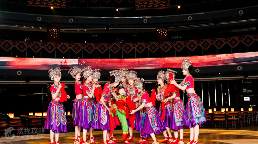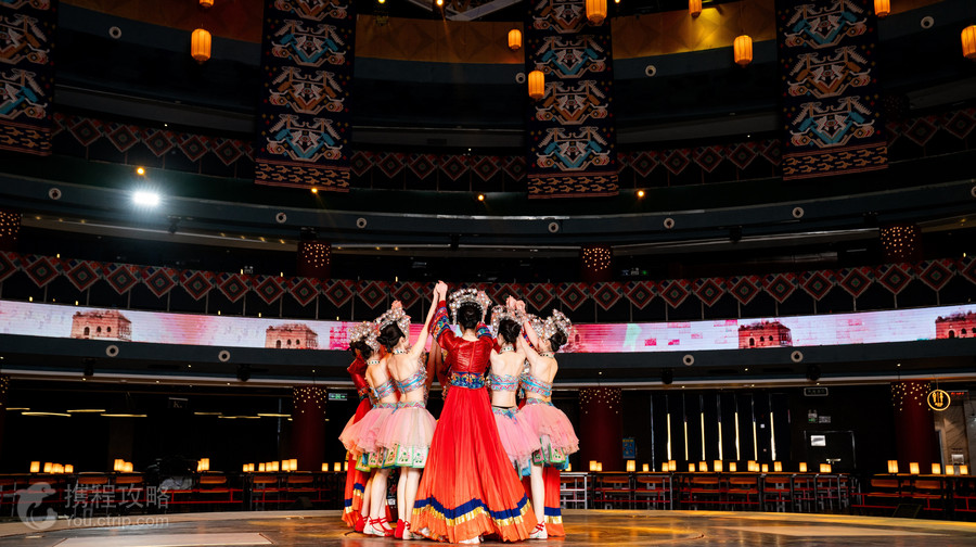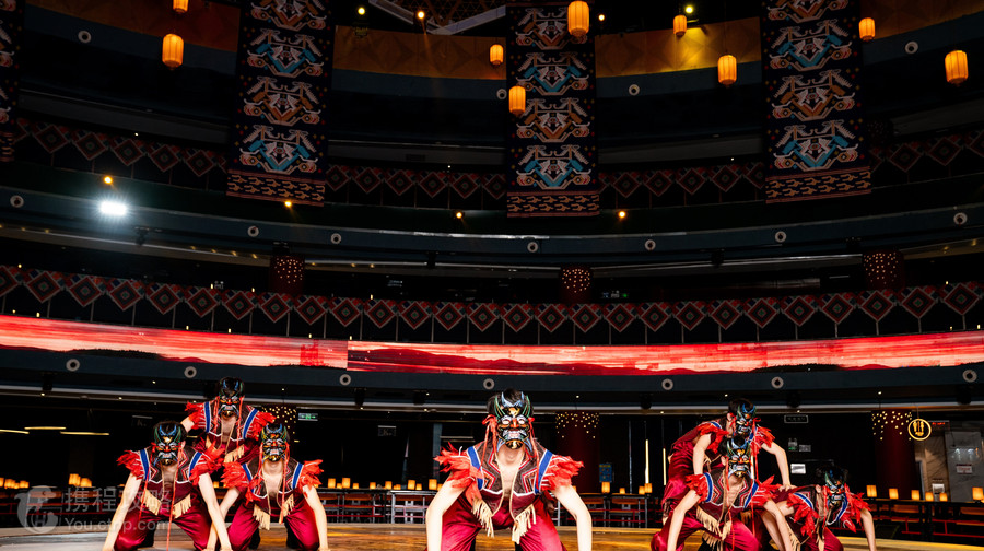 庸乐宫▪千禧宴全景歌舞剧场,作为城市核心商圈的文旅新地标与张家界文旅融合重点标杆项目,以“文化演艺+休闲娱乐+潮流社交”三位一体的创新模式,成为游客深度体验本土文化、市民高品质休闲社交的目的地,更凭借独特魅力跻身张家界旅游新名片之列。 庸乐宫前身为云顶会,总投资2.2亿元,本次升级改造投资4000万元,打造湖南省集宫廷宴与文化演艺于一体的特大型宫廷欢乐剧场。剧场单层5200㎡,设966席,空间3万余立方米,层高36米,配中央空调,双舞台设计恢弘大气。音响采用5套法国丽声原装设备,18台套超低音+全音频音响,搭配专业灯光效果,打造沉浸式视听盛宴。演艺团队由山东艺校28名骨干+本地十余位艺人组成,共40余人,演绎《古庸往事·归》,融合传统与现代演艺形式。