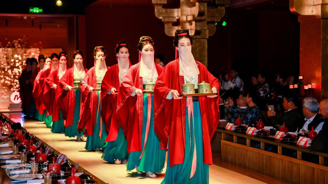 上海宫宴是一家位于静安区北京西路的沉浸式汉文化美食剧场,它将精致宫廷菜肴、古风演艺与传统文化体验融合在一起,为食客打造一场可看、可品、可参与的“穿越”之旅-在这里,用餐不仅是满足口腹之欲,更是一次全方位的文化沉浸。换装穿越:步入餐厅,首先会经过“妆造司”。这里提供了200多套从魏晋、唐、宋到明等各个朝代的精美汉服供你选择-2-4。你可以额外付费让工作人员帮忙打造一个完整的古风妆造,从现代人瞬间“穿越”为古代仕女或公子,真正成为这场盛宴的一部分。品宴观演:用餐区可容纳约160人,座位布局类似剧场,分为不同区域和排次,越靠前视野越好-2-8。整个宴席采用“位上菜”的形式,每上一道菜品,都会有与之主题相对应的古风舞蹈、戏曲或光影表演,将菜品背后的历史故事和人文情怀娓娓道来这里的菜品被定义为 “新宫廷菜” ,秉承了古代宫廷菜选料严格、烹饪精细的传统,同时融合现代烹饪理念,做到“传统不守旧,创新不忘本。